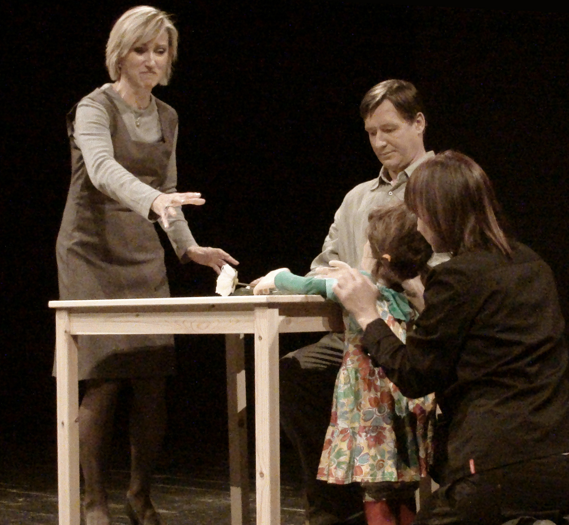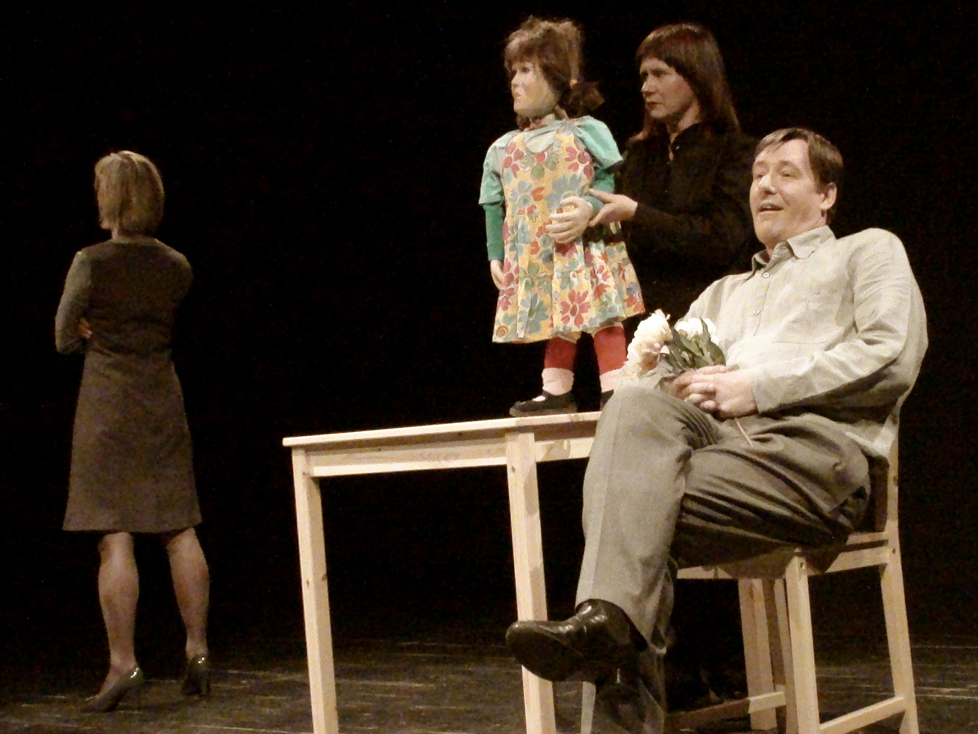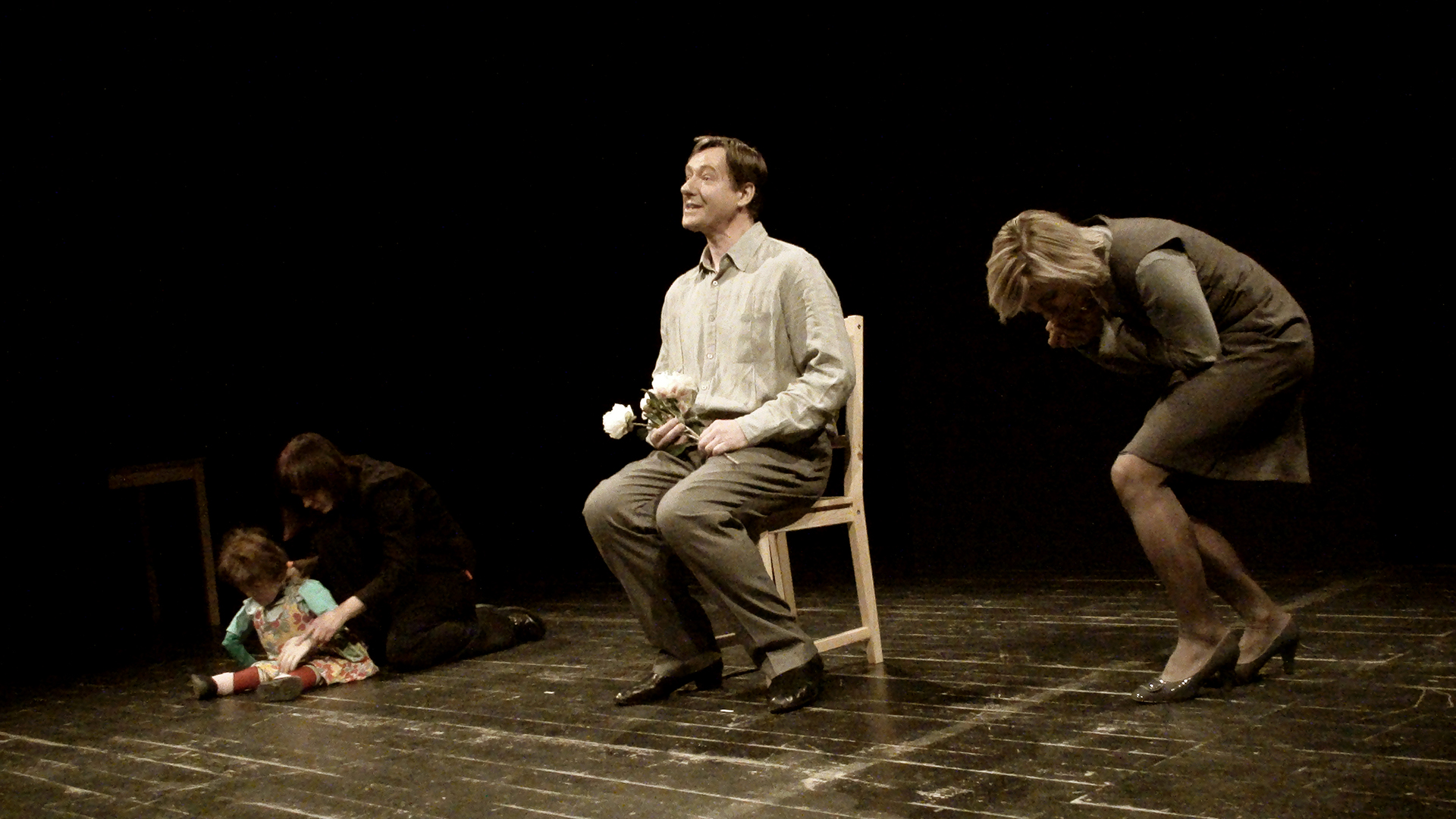 W spektaklu obserwujemy „obecność” trojga teoretycznie najbliższych sobie osób. Mijają się pozostając w osobnych „niekompatybilnych” światach. Tylko dziecko rozpaczliwie dobija się o swoje prawo do bycia dzieckiem. Dzieckiem swoich rodziców. Bezskutecznie.