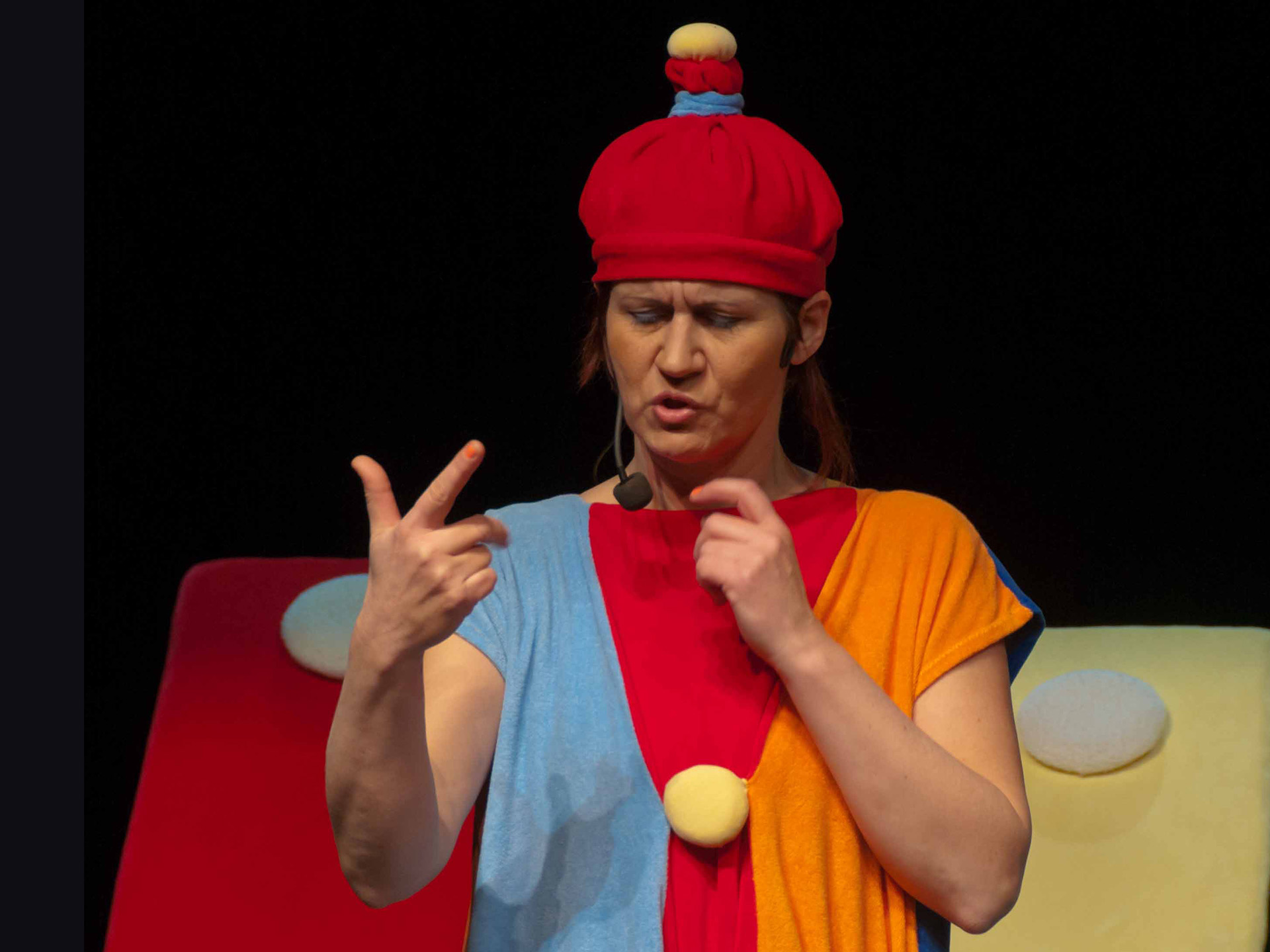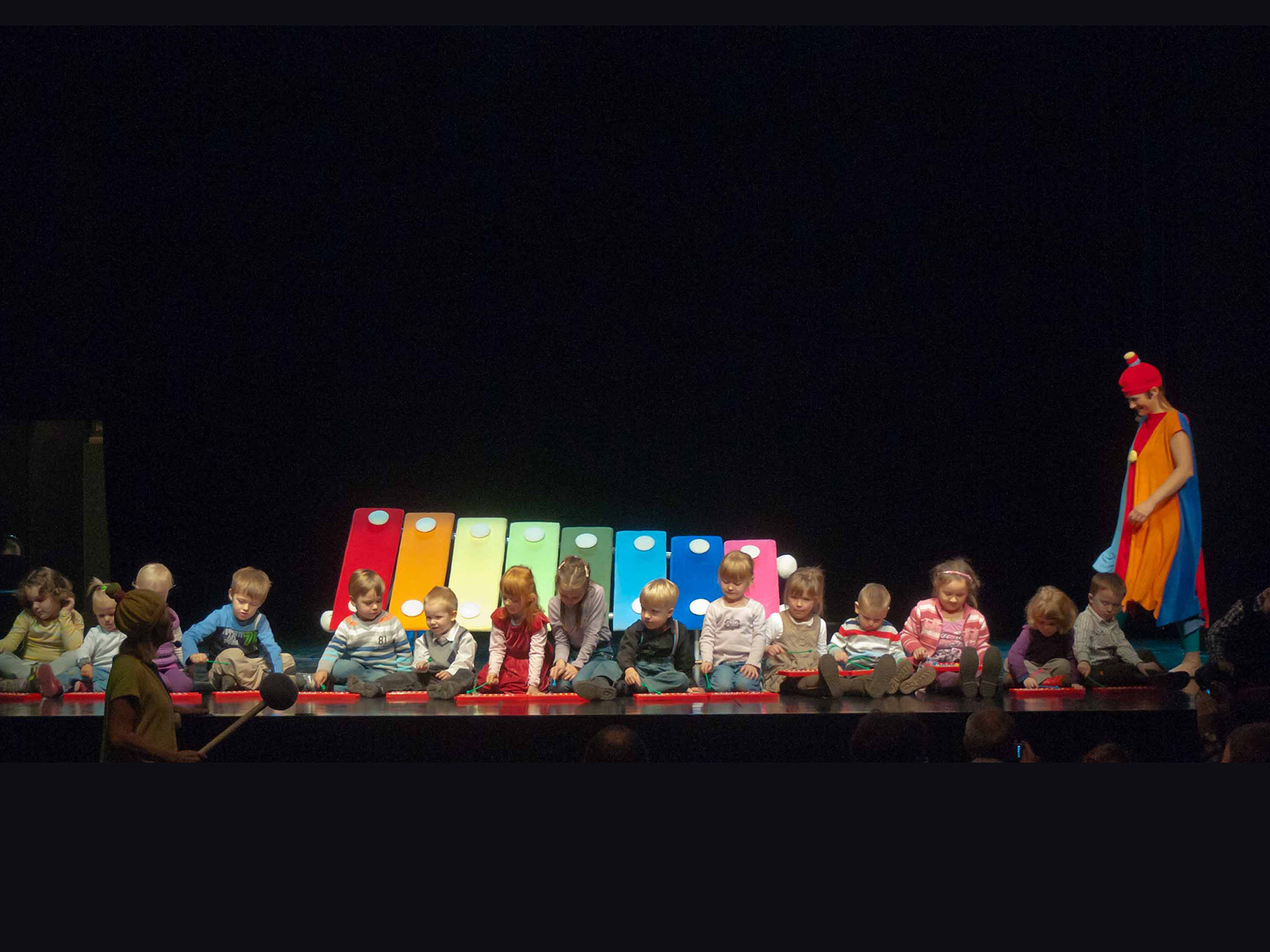 Połączenie zabawy głosem ludzkim oraz śpiewu z dźwiękami wydobywanymi z niezwykłego instrumentu: dużych kolorowych cymbałków (dzwonków chromatycznych) - stanowiących obok barwnych kostiumów aktorów jedyny element scenografii - daje świetny pretekst do wspólnej zabawy w muzykowanie. Każdy mały widz po przedstawieniu otrzymuje do wypróbowania własny instrument (małe cymbałki) by całość spektaklu zakończyć "wielkim koncertem".