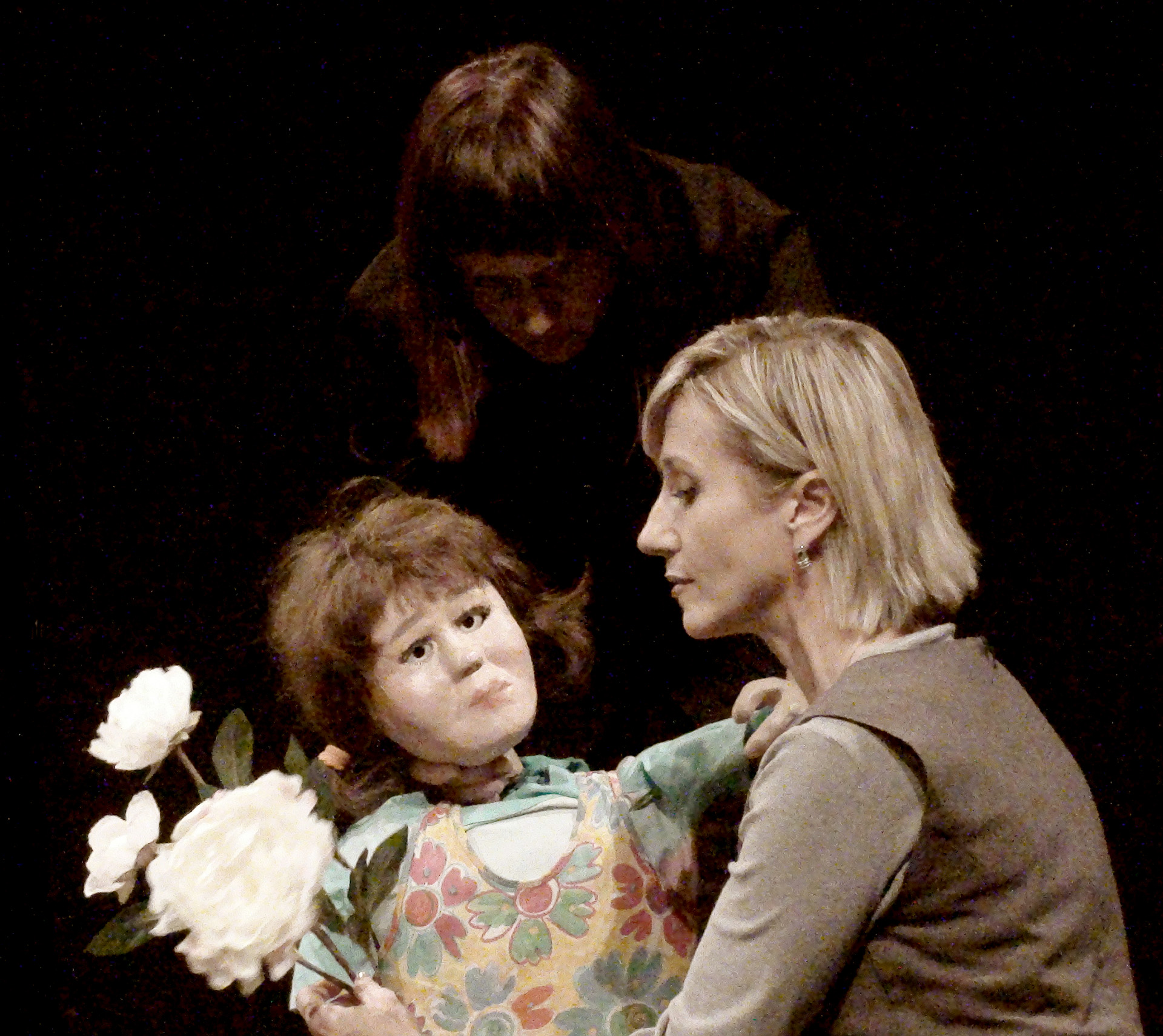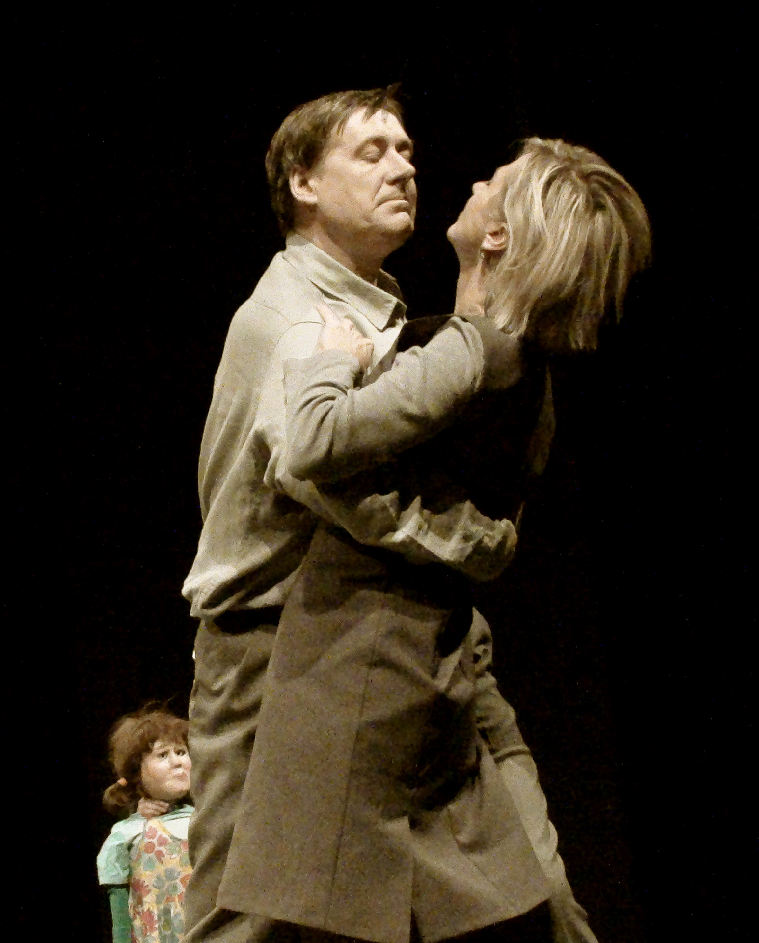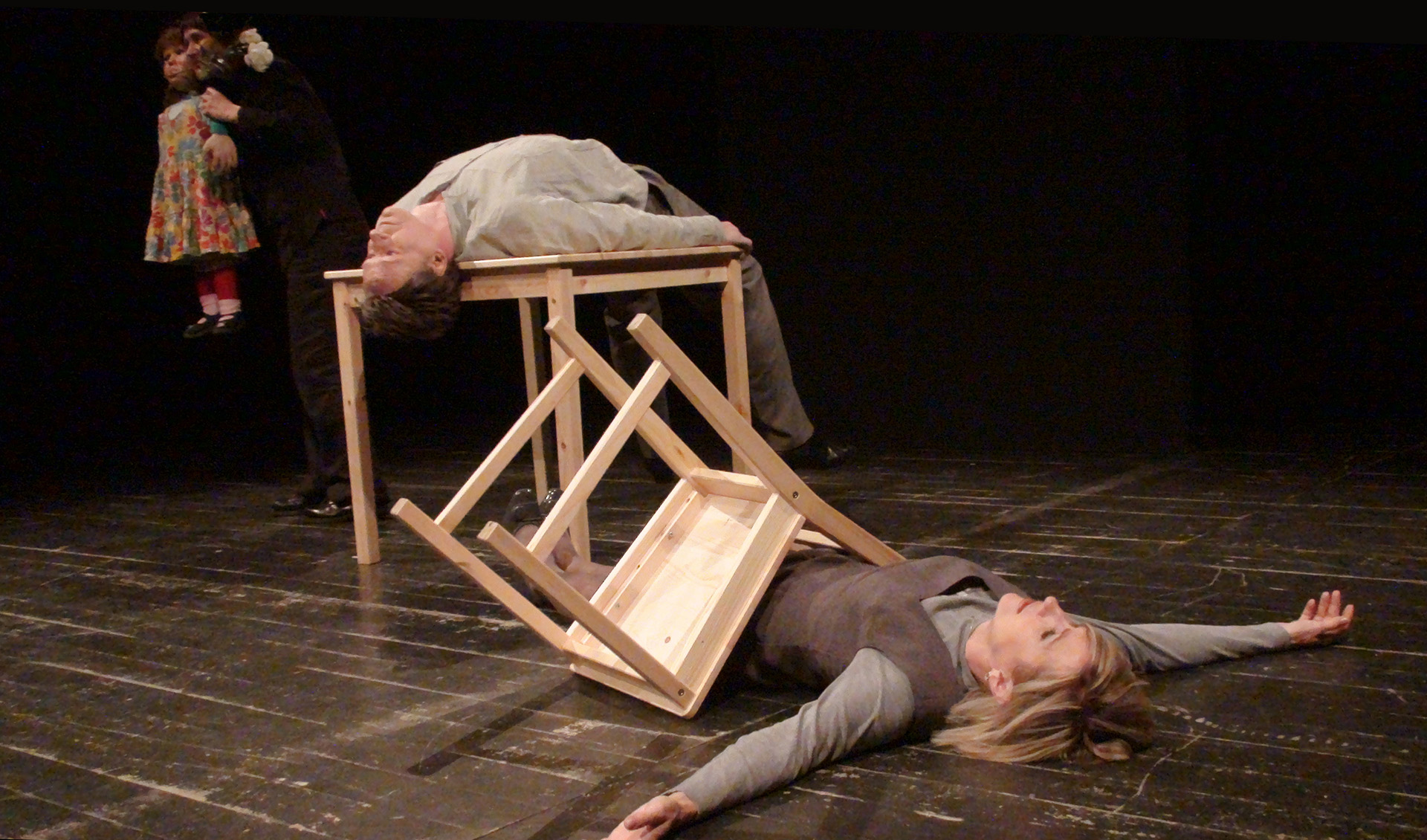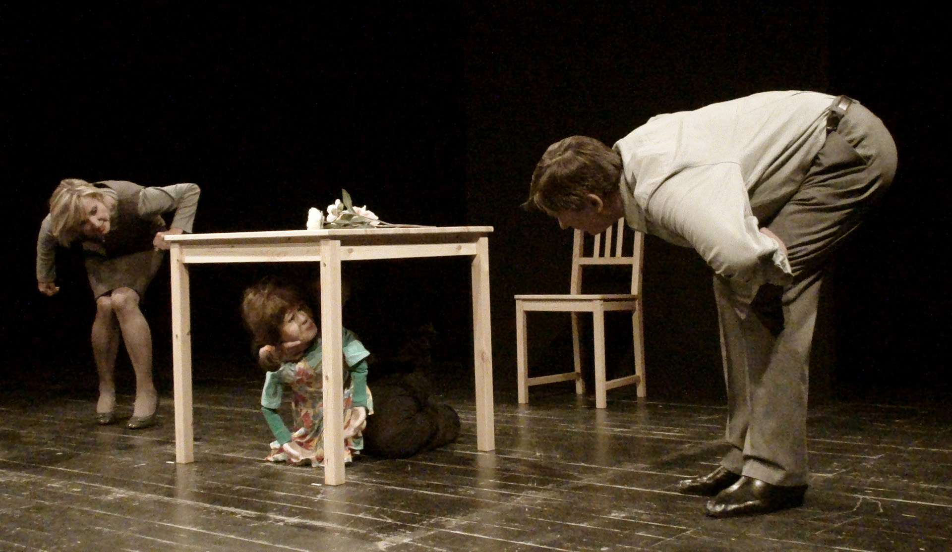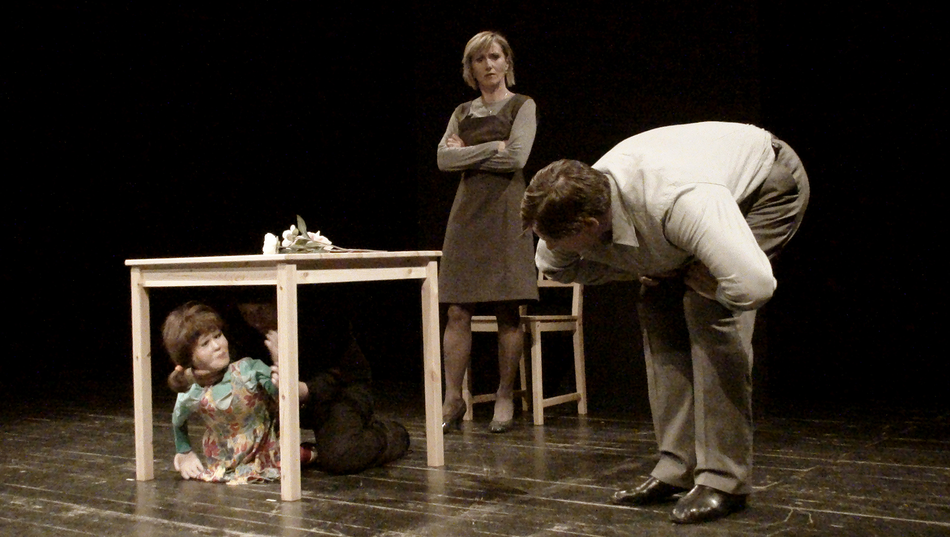 W spektaklu obserwujemy „obecność” trojga teoretycznie najbliższych sobie osób. Mijają się pozostając w osobnych „niekompatybilnych” światach. Tylko dziecko rozpaczliwie dobija się o swoje prawo do bycia dzieckiem. Dzieckiem swoich rodziców. Bezskutecznie.