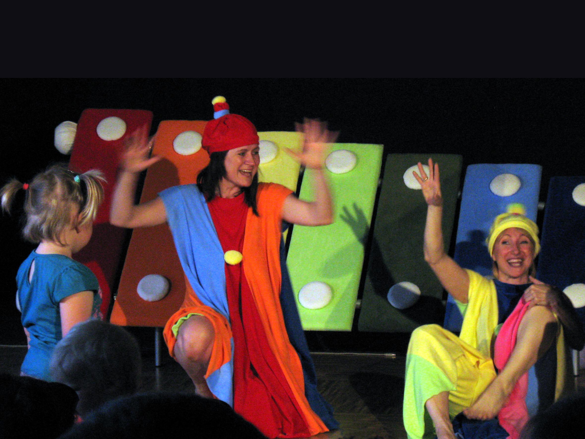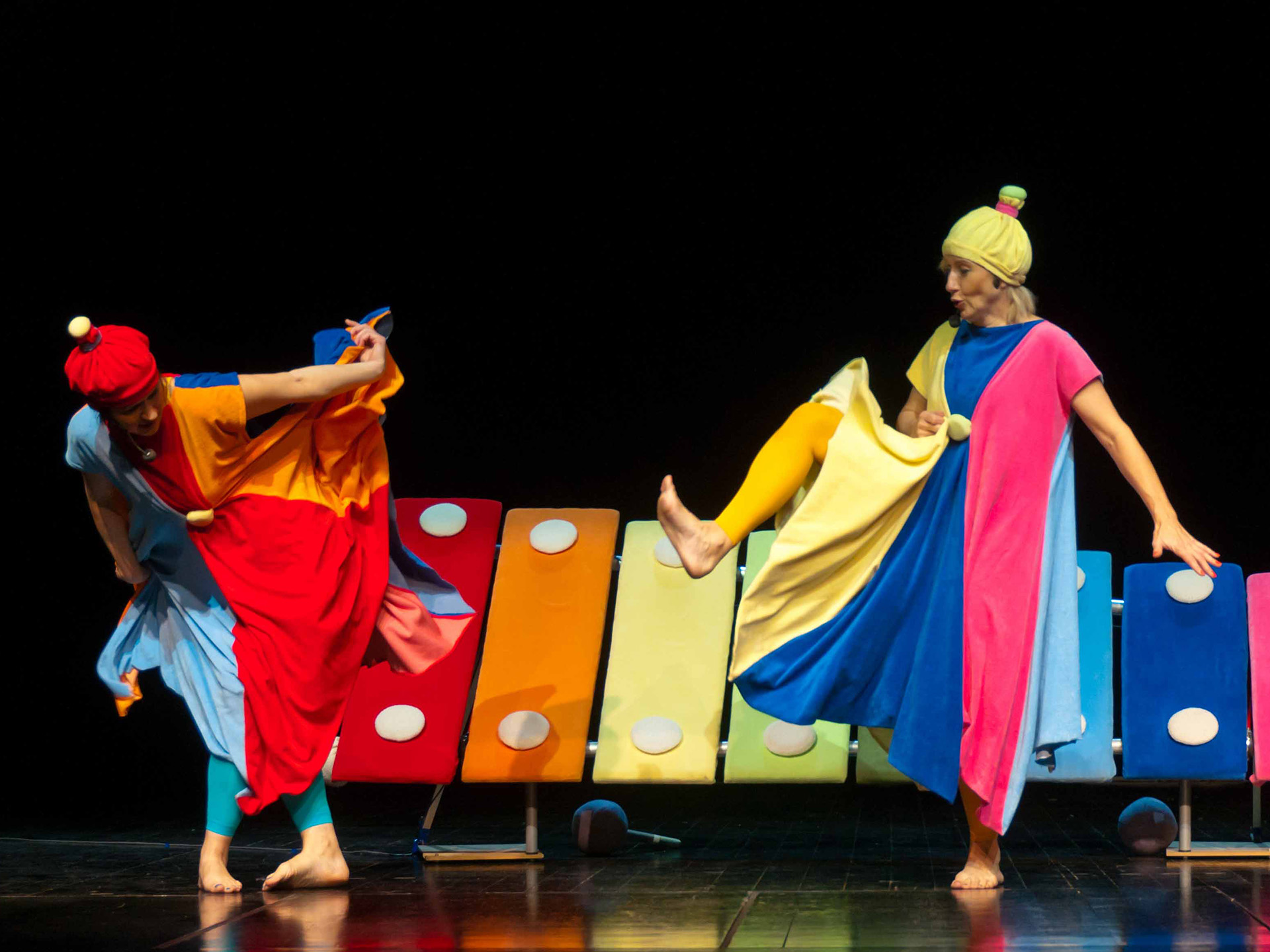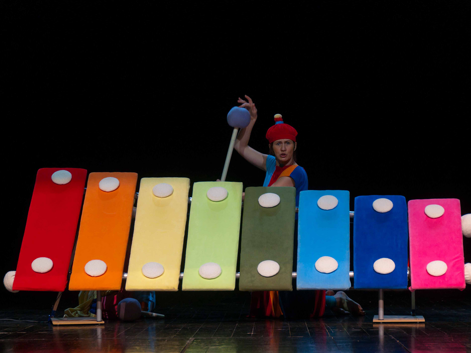 Połączenie zabawy głosem ludzkim oraz śpiewu z dźwiękami wydobywanymi z niezwykłego instrumentu: dużych kolorowych cymbałków (dzwonków chromatycznych) - stanowiących obok barwnych kostiumów aktorów jedyny element scenografii - daje świetny pretekst do wspólnej zabawy w muzykowanie. Każdy mały widz po przedstawieniu otrzymuje do wypróbowania własny instrument (małe cymbałki) by całość spektaklu zakończyć "wielkim koncertem".