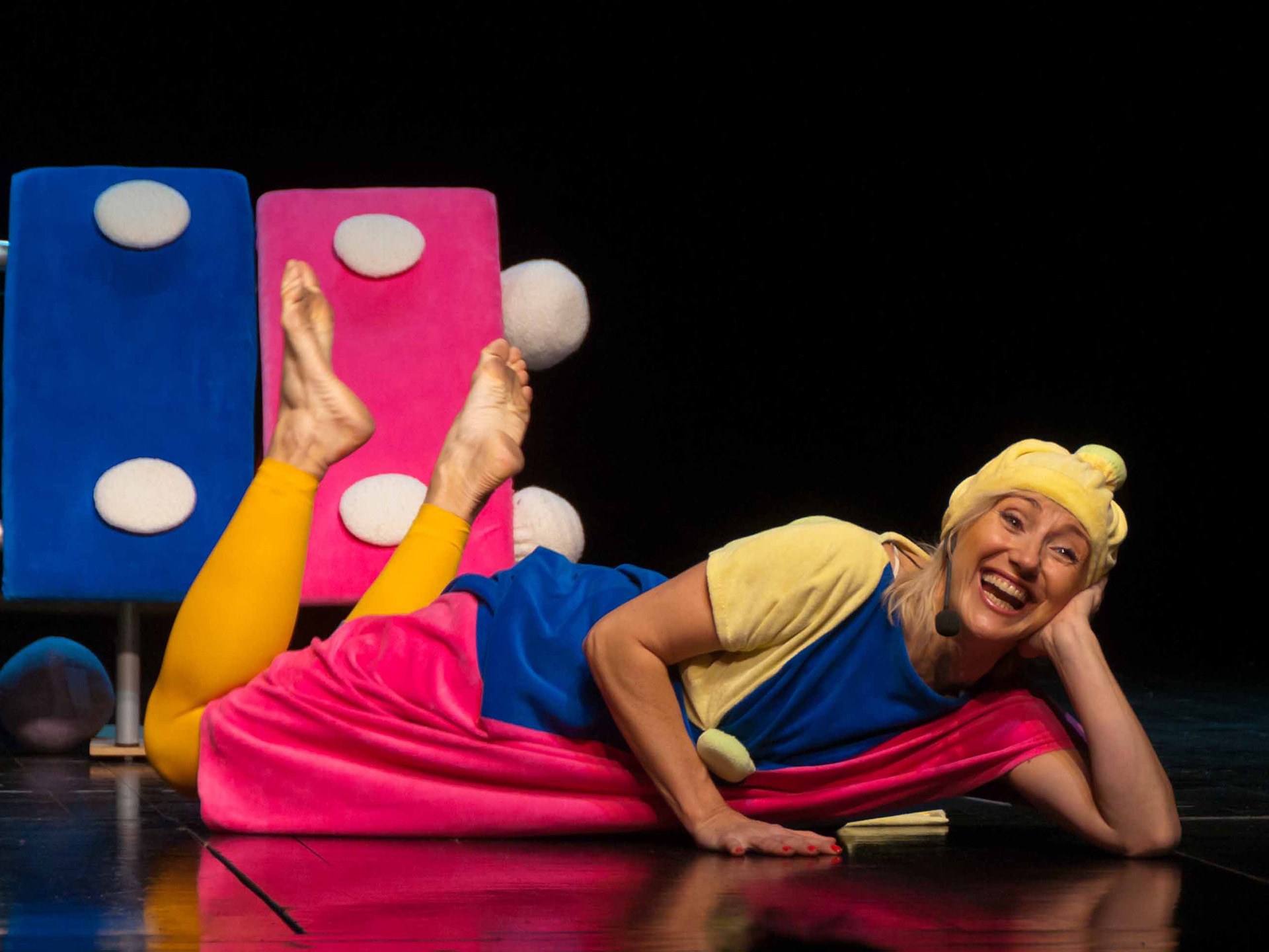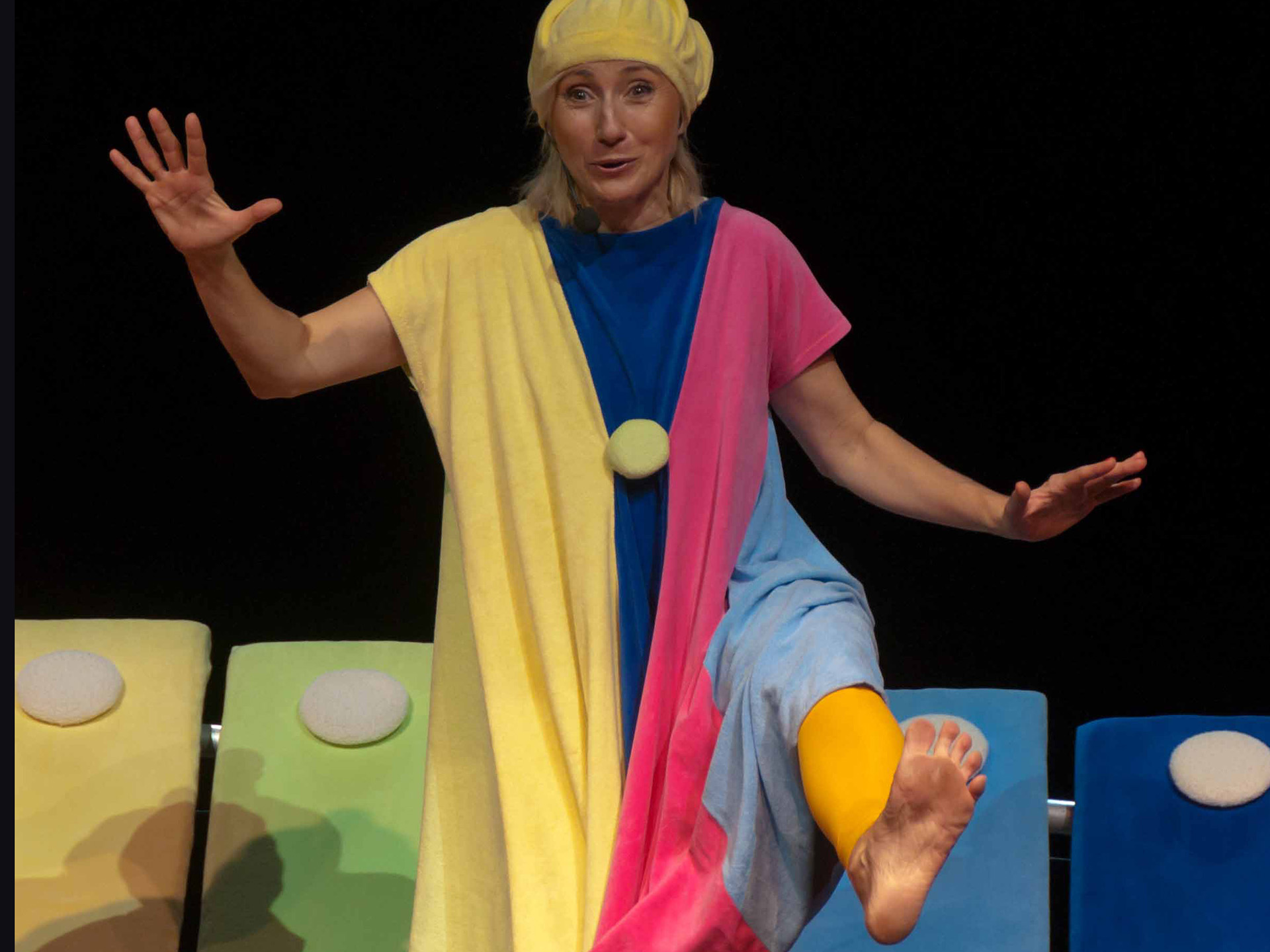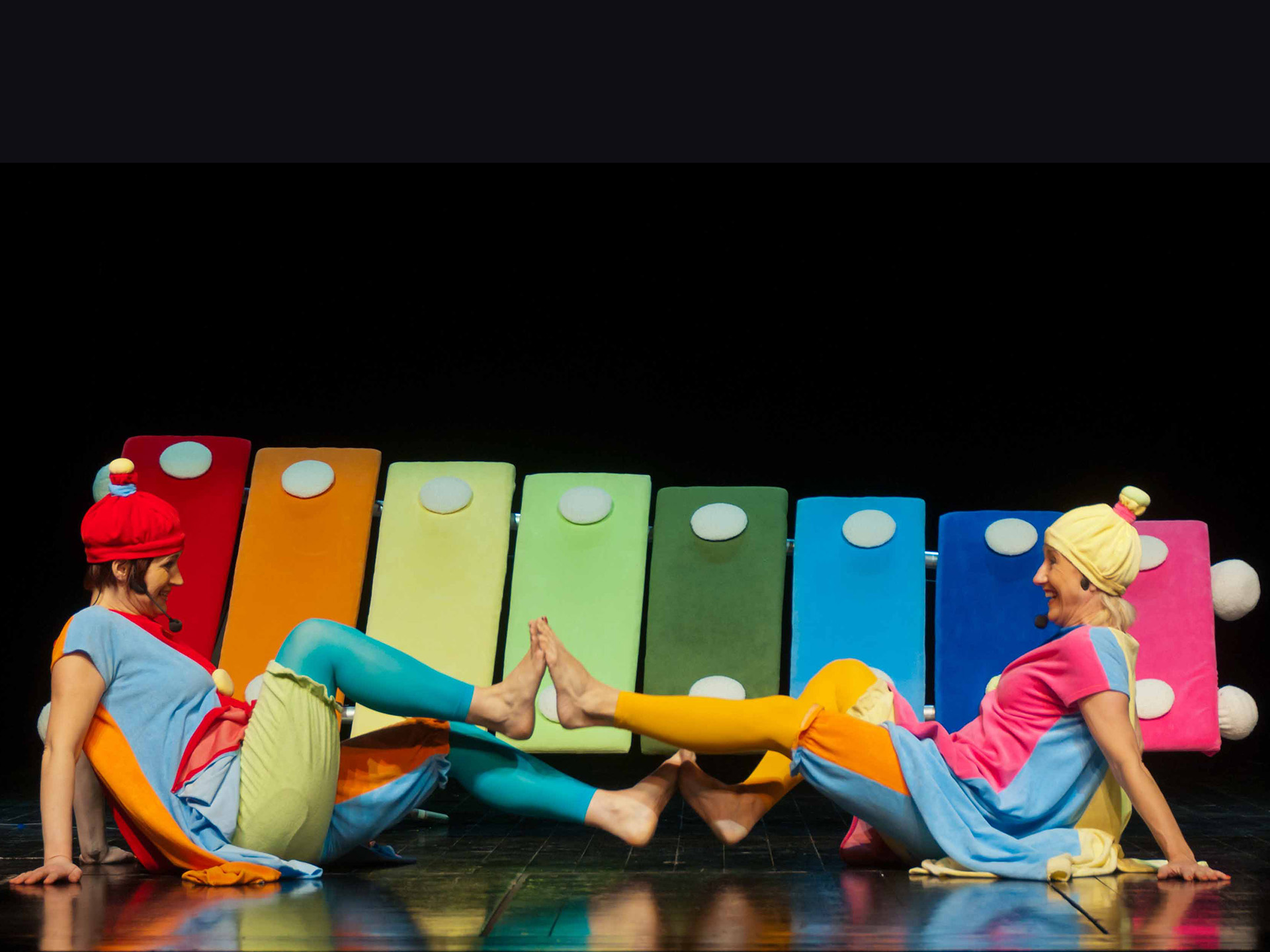 Połączenie zabawy głosem ludzkim oraz śpiewu z dźwiękami wydobywanymi z niezwykłego instrumentu: dużych kolorowych cymbałków (dzwonków chromatycznych) - stanowiących obok barwnych kostiumów aktorów jedyny element scenografii - daje świetny pretekst do wspólnej zabawy w muzykowanie. Każdy mały widz po przedstawieniu otrzymuje do wypróbowania własny instrument (małe cymbałki) by całość spektaklu zakończyć "wielkim koncertem".